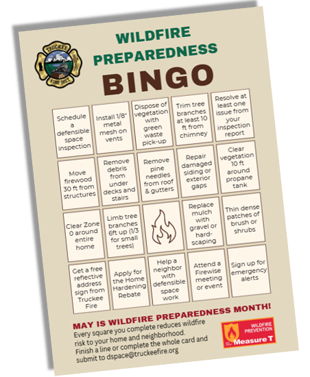Keeping your home safer from fire has never been more fun! This year Truckee Fire is launching Wildfire Preparedness BINGO to make it easy, engaging AND rewarding to check items off your to-do list. Stay tuned for announcements in conjunction with May Wildfire Preparedness Month.