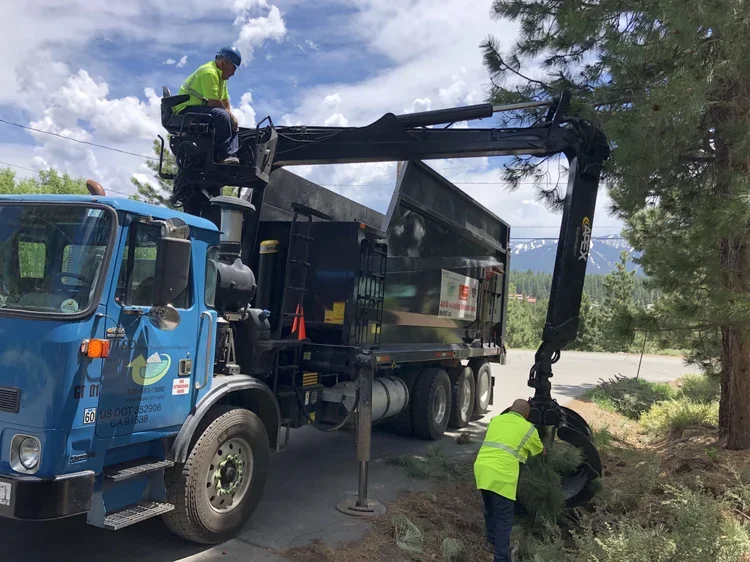Truckee Fire offers free Curbside Green Waste Pick-Up. Pile your woody biomass at the curb, request a pick-up, and our crew will collect it with a grapple truck and haul it away!
